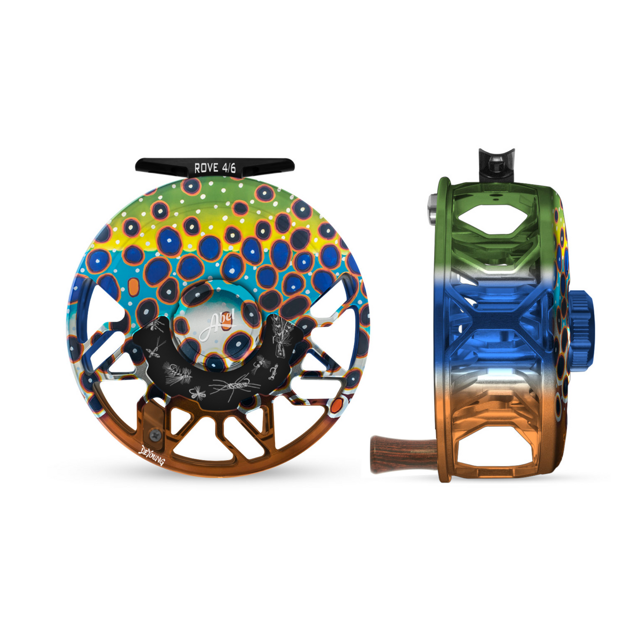- Laser engraved fresh and saltwater flies on reverse side of drag plate that rotate as line is being retrieved