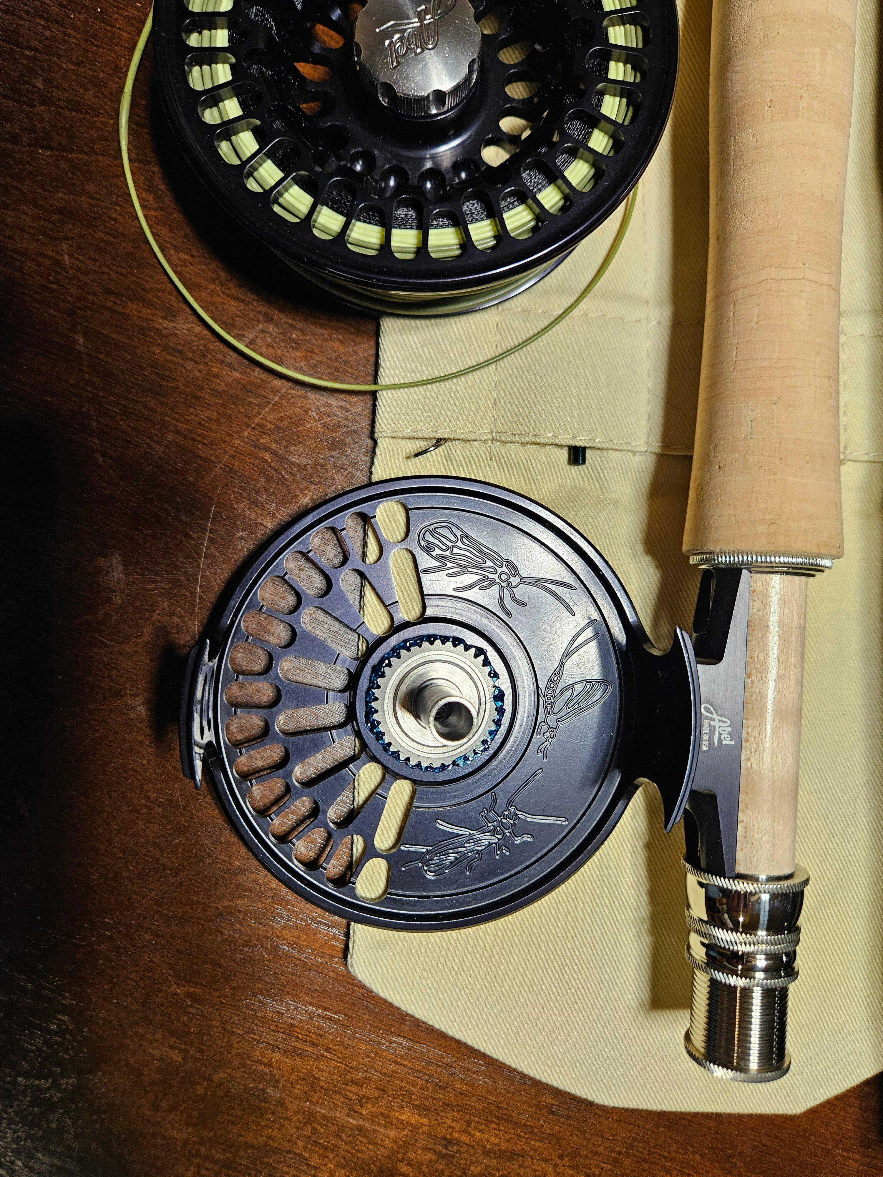 Please note that pricing does not update until the reel is added to the cart. The basic, black reel is $450 and DeYoung Trout prints are $1250 - other prints and finishes are typically between $850 and $950 (the reel in the photo is the reel you will receive, some variations occur with the wooden handles)