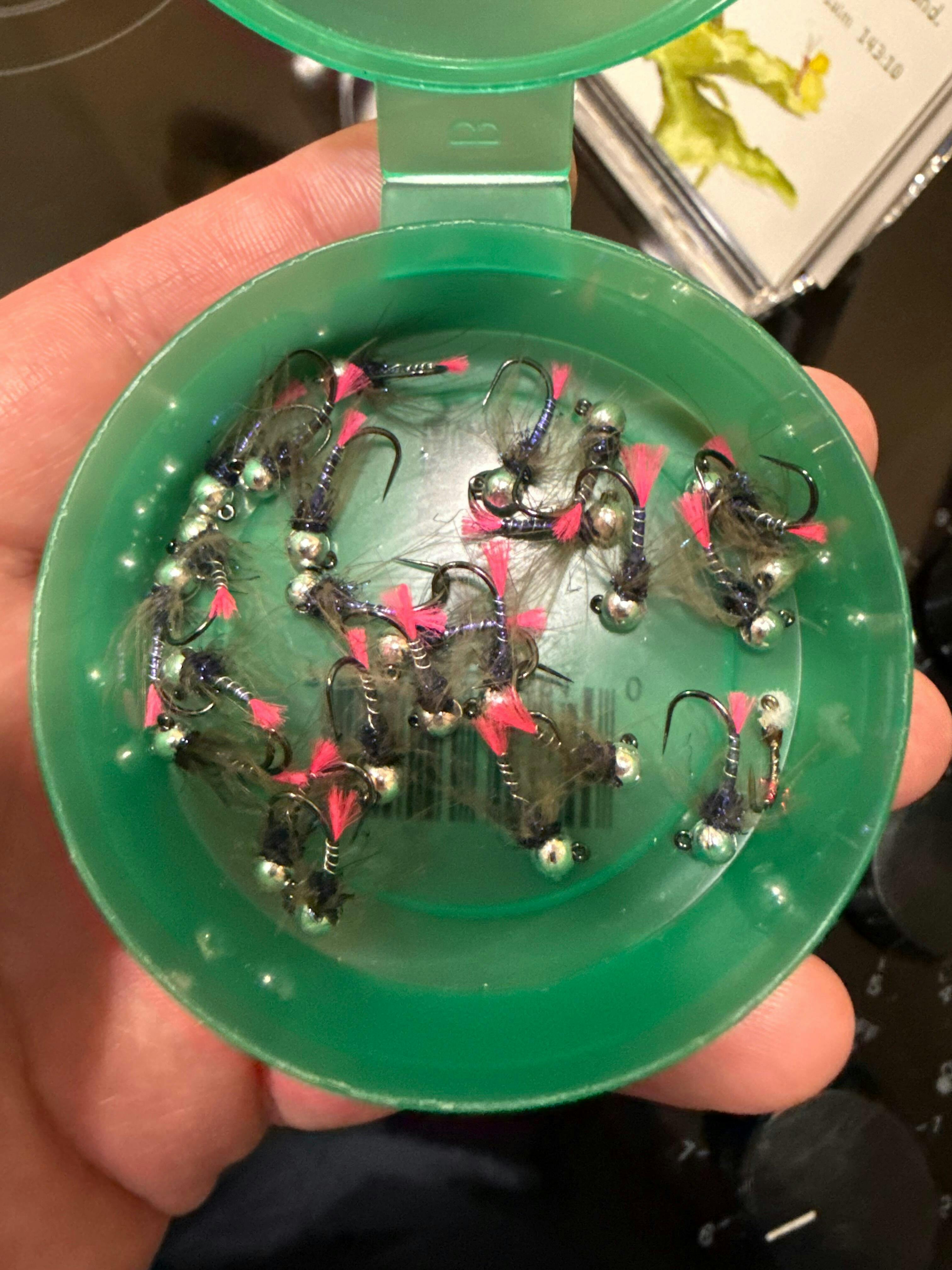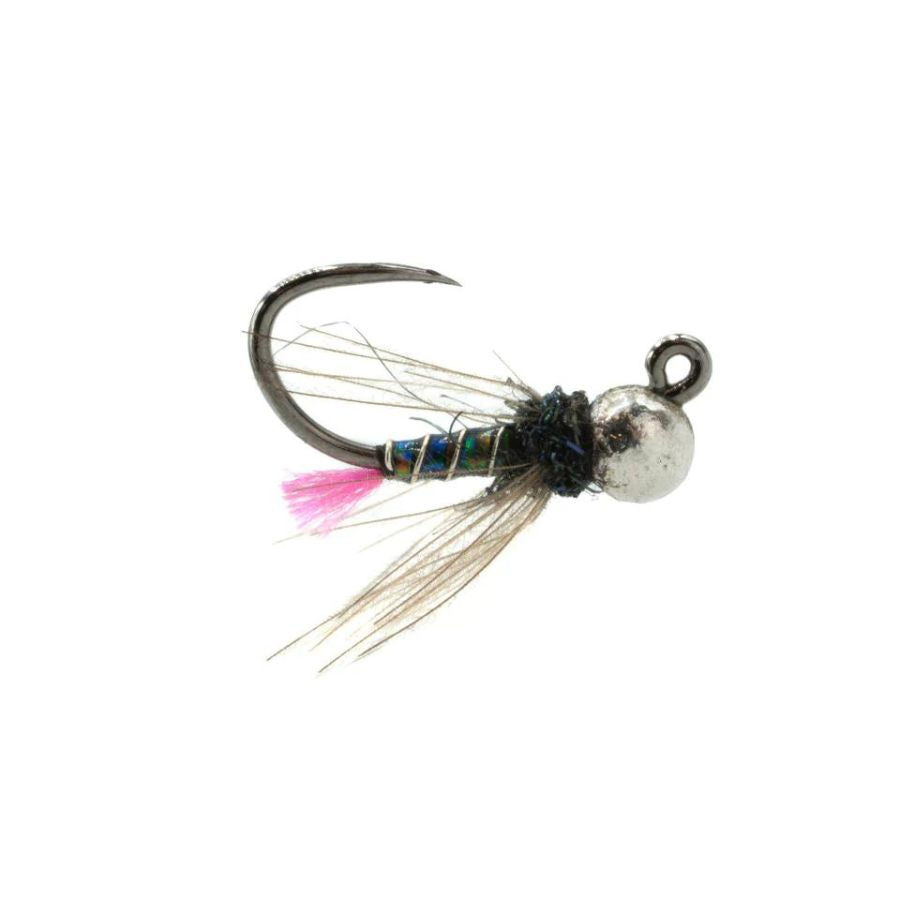 The pink tag against the dark silhouette of the body helps trout find it when their vision is limited.